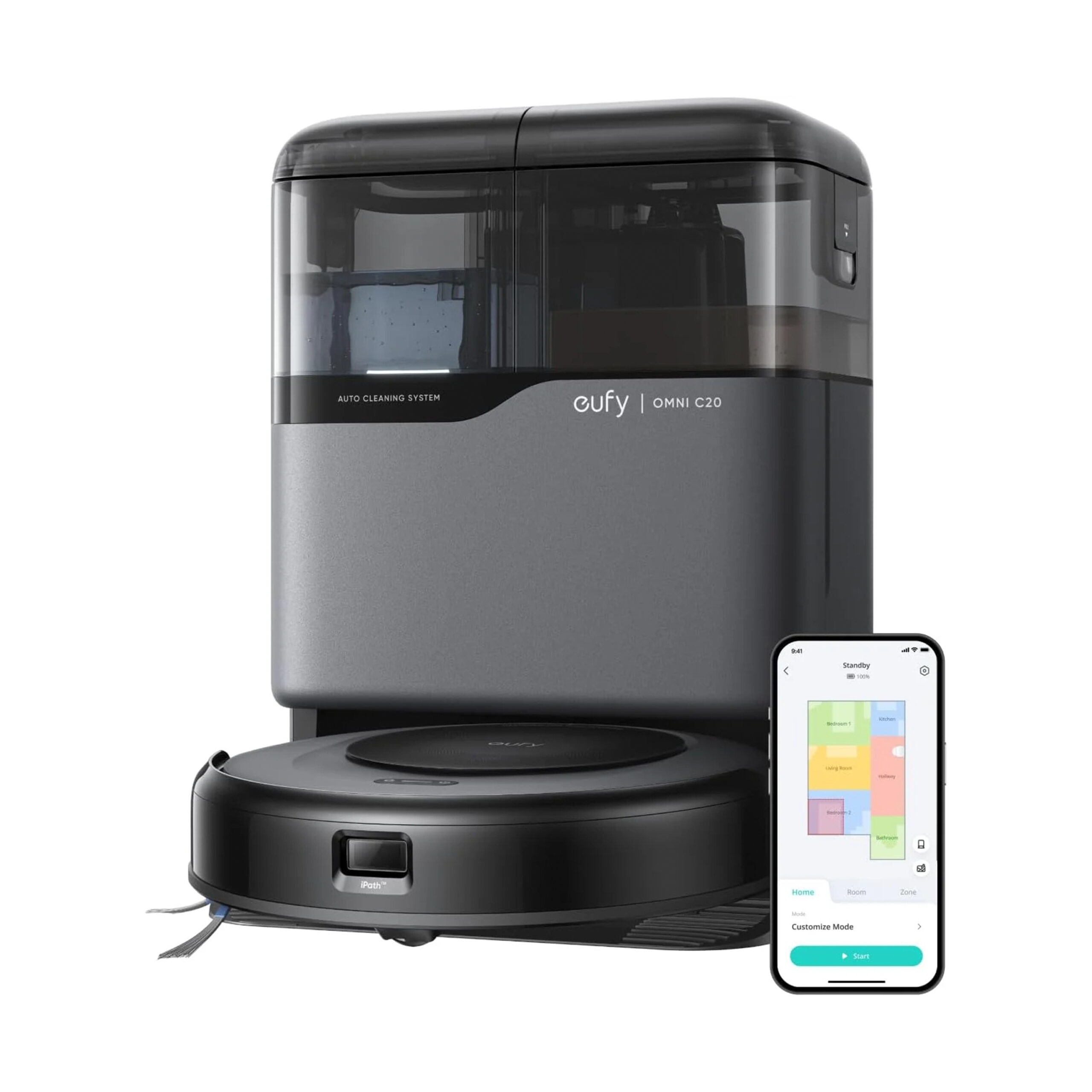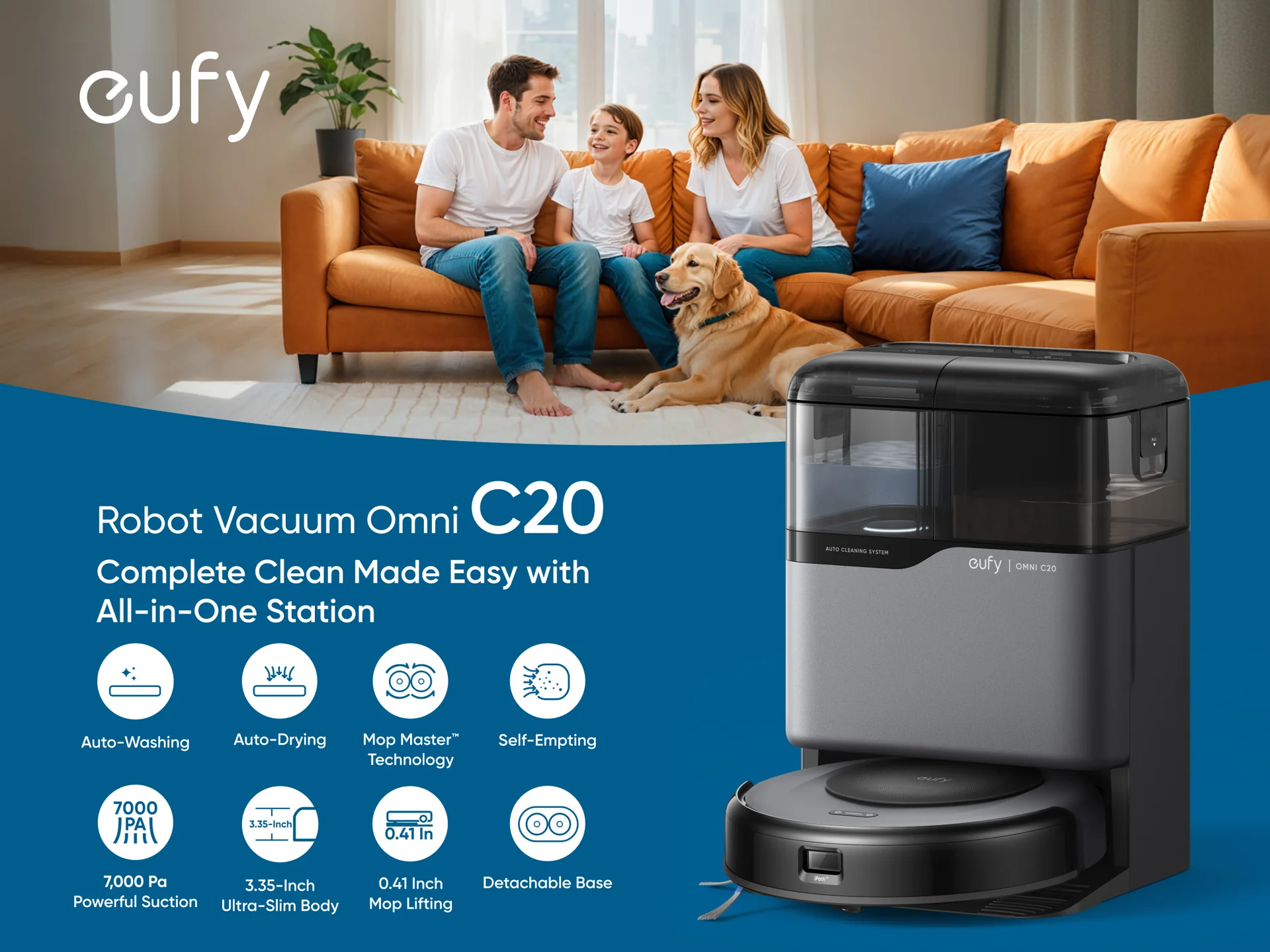The eufy Robot Vacuum C20 is a smart robot vacuum that combines powerful suction and mopping with an all-in-one station that automatically empties dirt, washes, and dries the mop head effortlessly. It boasts a powerful 7000 Pa suction for cleaning dust, hair, and dirt, Mop Master™ technology for deep mopping, and a slim 3.35-inch design for easy access under furniture. It features a Pro-Detangle brush to minimize hair tangling and a LiDAR/Smart Mapping system for precise navigation and app-based identification of restricted areas and zones. Controllable via the app and with Alexa and Google Assistant for smart, personalized cleaning .